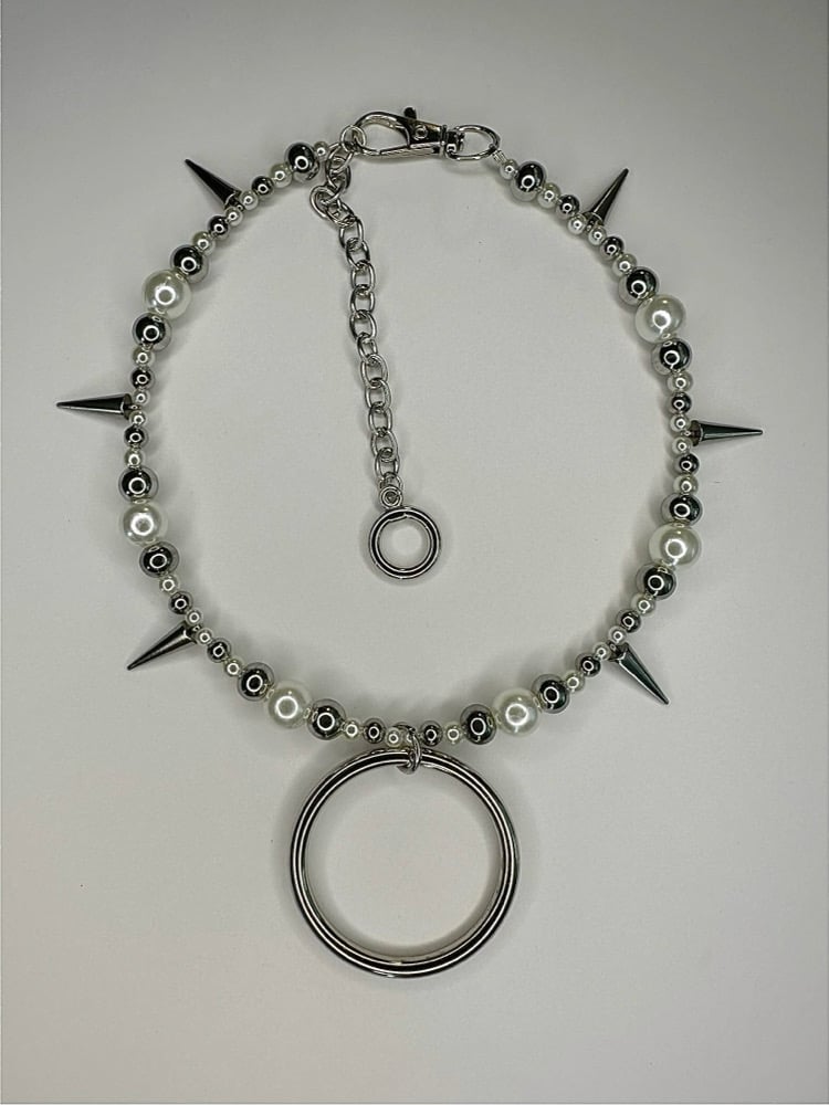 Made with pearl beads, stainless steel beads, stainless steel spikes, and a giant circle pendant! Meant to fit like a choker, about 14 inches in lengths with an additional 3 inch extension chain! <3